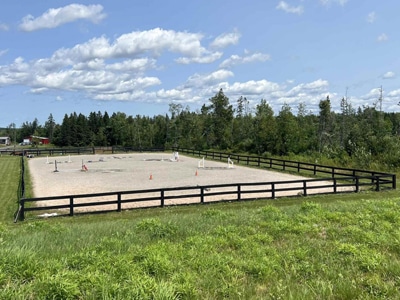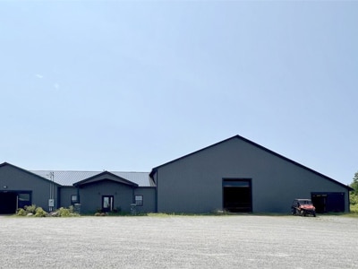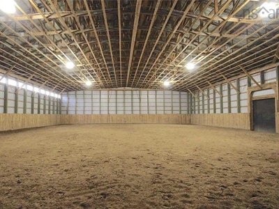 The Barn: The 26-stall barn has spacious 12′ main aisles, rubber footing and stall mats, 2 foaling stalls, wash stall, tack room, 7-stall quarantine area, feed room and 60×80 indoor arena with heated viewing lounge. Apartment with a kitchen, bathroom, bedroom and office. Nine paddocks, 120×200 outdoor ring, 2 grazing fields.