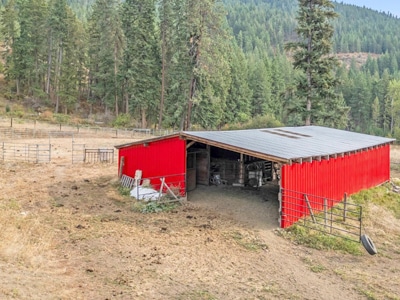 The Barn: Barn with 3 stalls, fenced paddocks, round riding pen, flowing creek.