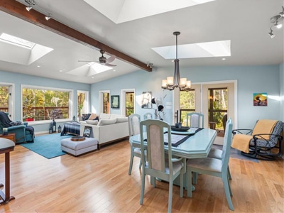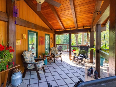 The House: Beautifully renovated 3-bedroom, 3-bath home w/vaulted cedar ceilings, skylights, wrap-around covered deck and hot tub. Gardens, fruit trees, 36’x42′ machine shed, equipment shed, and wood shed.