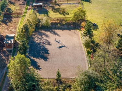 The Barn: Solid 3-stall barn with feed, tack, and hay rooms, large paddocks and fields, shelters for up to 9 horses, all with power and lights, 85’x185’ all-weather riding ring with rubber footing and lights.