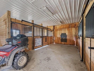 The Barn: A 36′ x 50′ fully insulated barn/workshop featuring hydro, office space, storage, four 10′ x 12′ horse stalls. Spacious paddock with heated waterer, run-in shed.