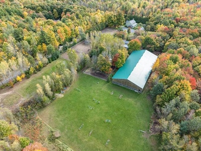 The Barn: A 9-stall stable with large tack room, 170″ x 80′ indoor arena, outdoor grass riding area, multiple paddocks and turnouts with shelters. Plenty of trails to explore.