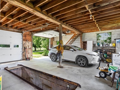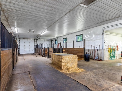 The Barn: State-of-the-art 40’x120′ horse barn features 12 box stalls, 3 tie stalls, wash bay, feed room and tack room. Thirty acres of paddocks plus 30 acres of hay fields. Original bank barn, 30’x60′ 4-bay shop, and coverall building for hay and equipment storage.