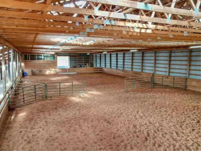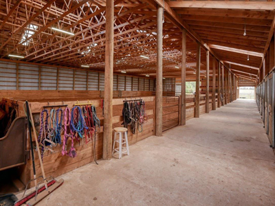 The Barn: Main barn with 16 box stalls, 3 standing stalls and tack room with lockers. Indoor riding arena with heated viewing lounge. Secondary barn with 4 box stalls, 2 foaling stalls and 2 dog kennels. Hay storage areas, 10 fenced paddocks, 4 fenced pastures. Living quarters above garage/shop.