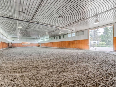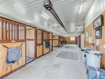 The Barn: An 70×140 heated indoor arena, two attached barns with a total of 15 stalls, wash bay, tack and storage room with 12 lockers, enclosed treadmill, lots of storage for hay and equipment. Additional detached barn with 4 stalls, 210×150 outdoor riding arena with GGT footing, 14 turnout paddocks, 4 grass fields and scenic riding trails. Property licensed for international horse quarantine.