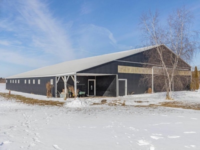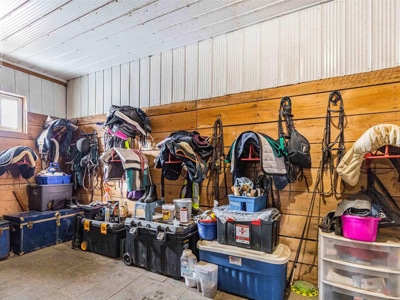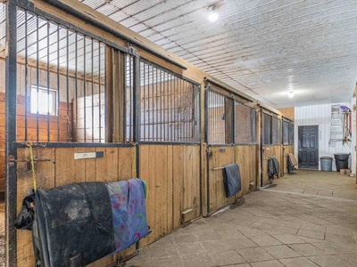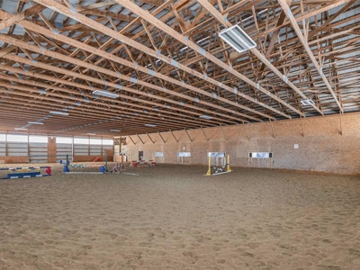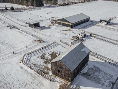 The Barn: This 98.7-acre property has two barns: one with 8 stalls, heated tack room and wash stall, and a bank barn with hay loft, 9 box stalls, locker area. 70′ x 120′ indoor riding arena, outdoor riding ring, 7 paddocks, indoor shavings storage, manure building and outhouse. 30 acres dedicated to hay production, 57 acres of bush with stream and trails.