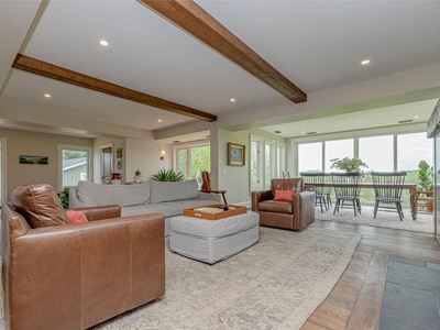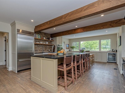 The House: Open-concept main floor with radiant in-floor heat, beamed ceilings, stone fireplace, expansive kitchen with walk-in pantry. Covered porch overlooks pool, hot tub, perennial gardens. Lower level with games room, office and gym. One-bedroom guest house.