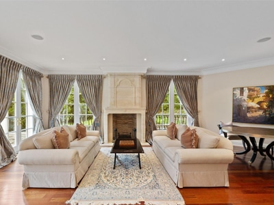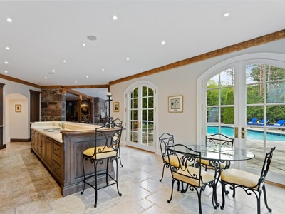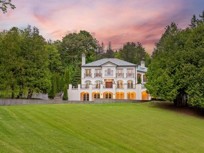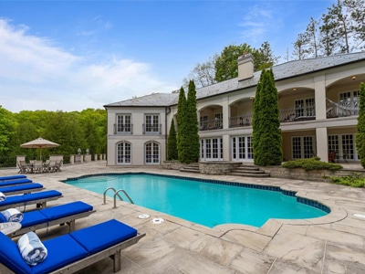 The House: A 7,000 sq.ft. limestone and slate manor with 6 bedrooms, 5 bathrooms, marble rotunda, private balconies, dual gated tree-lined drives. The 100-foot limestone terrace overlooks the heated salt-water pool, whirlpool and hot tub. Lower level with games lounge, wet bar, guest suite.