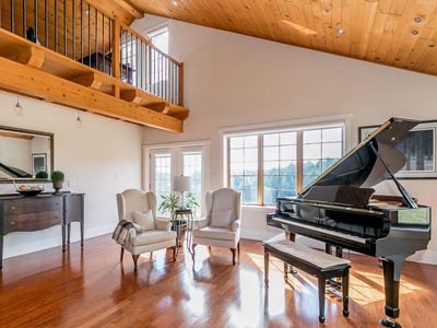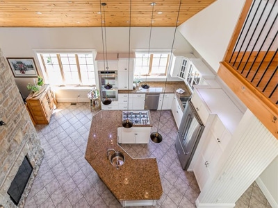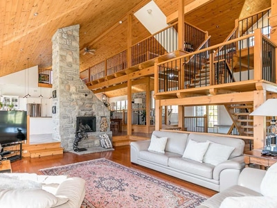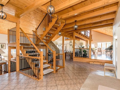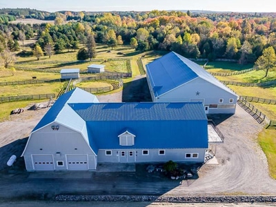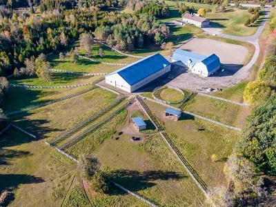 The Barn: State-of-the-art 70′ x 146′ indoor arena, heated viewing lounge, 175′ x 175′ well-lit all-weather outdoor riding ring, 70′ round pen, barn with 9 stalls and 9 paddocks. Trails along Humber River.