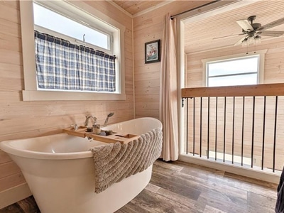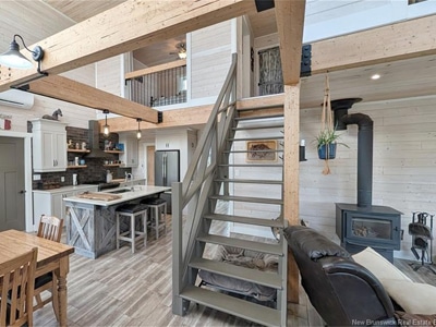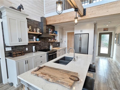 The House: Elegant farmhouse-style home with 2 bedrooms and 2.5 baths, heated floors, 23-acre managed woodlot, 3 sheds for ample storage.