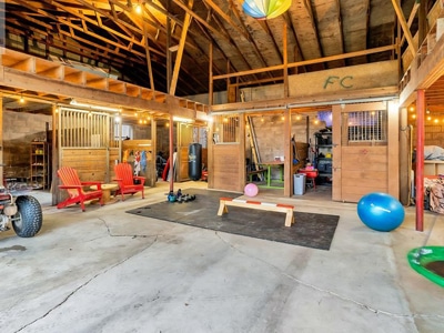 The Barn: A large workshop and a barn with multiple horse stalls, perfect for hobby farming or equestrians.