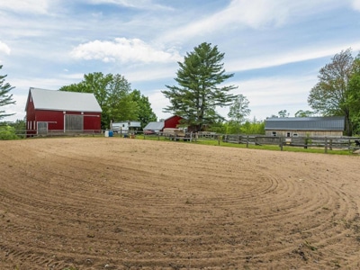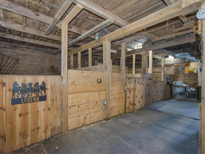 The Barn: Refurbished barn with multiple stalls, paddock, lean-to, riding ring, pastures with solar-powered fencer and water access. A 30×36 workshop with woodstove and hoist.