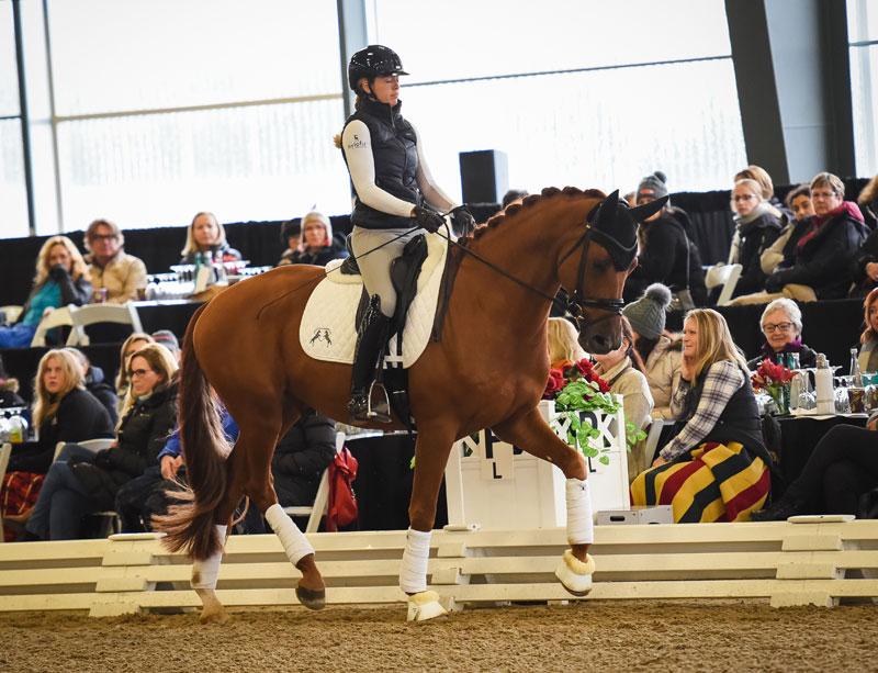 Janine Little and Billionaire were next up in the ring, representing Third Level. In sharp contrast to the younger horses, Billionaire was a bit too complacent for Dujardin’s liking, despite the large crows. As Dujardin introduced the audience to the more advanced dressage work such as shoulder in, travers, half pass and flying changes, she pushed Janine to always take risks and ask the horse for more energy, activity and expression.