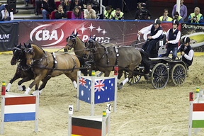 It was by no means a certainty that Exell would win again, however. One of his experienced leader horses, the 17-year-old gelding Spitfire, did not pass the first horse inspection due to a minor injury in his foot and Exell was forced to put his spare wheeler horse Clinton Star in the lead of his four-in-hand. Exell put Clinton Star to the test in the warm-up competition and the prizegiving ceremony on the first day, when he finished second behind Koos de Ronde. Exell’s gamble paid off and Clinton Star got even faster in today’s FEI World Cup™ Driving competition and contributed to the Australian’s second victory of the season. Following wins in 2008 and 2009, this was Exell’s third win in Budapest. Local hero Jozsef Dobrovitz, from the nearby village of Vecsés, was cheered on by his enthusiastic home crowd in the Laszlo Papp Arena and drove his team of Lipizzaner horses to a well-deserved second place.