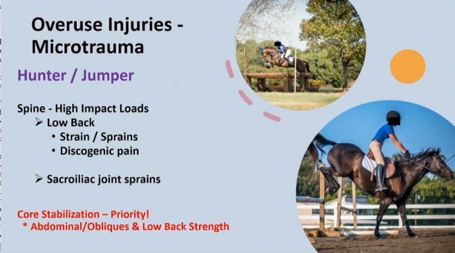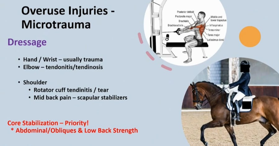 “This was all pulled from research that I looked at on general overuse. Common injuries reported are hand, wrist—usually some sort of trauma—elbow tendonitis/tendinosis from hanging onto the reins. There are a lot of shoulder issues with this: rotator cuff tendonitis, possibly even tears, and mid-back scapular problems. You’ve got to have strong mid-back scapular thoracic stabilization, which we spend a lot of time on.”