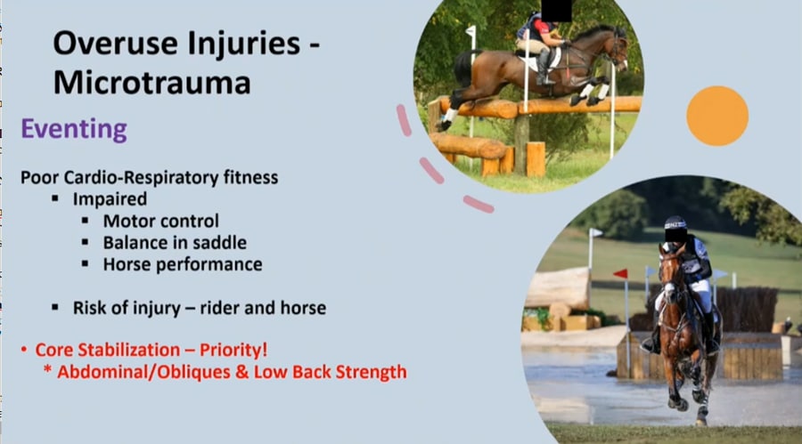 “At the bottom of each of these slides, you see a consistency in red. Core stabilization is priority for all of these sports. You’re on the back of a horse, you’ve got to have core stability! We don’t just look at abdominals, we look at obliques, multifidus, several different muscles in the abdominal region and for back strength. So it’s not just doing sit-ups; you’ve got to do all kinds of other variations for core stability.”