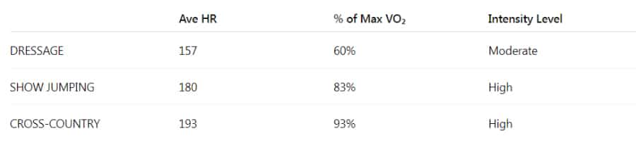 In another study, 16 competitive collegiate-level female eventers had their heart rates monitored and the % of max VO₂ (volume of oxygen utilized by the body) recorded during the three phases of an event:
